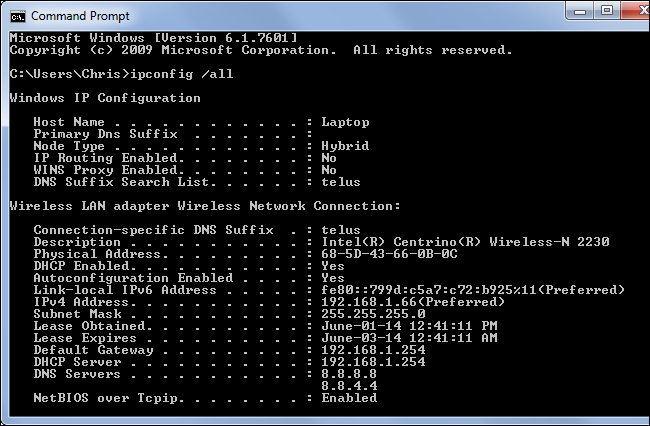 Por ejemplo, puede usar el comando ipconfig /all en Windows para ver todas las interfaces de red configuradas, sus direcciones IP, servidores DNS y otra información. O bien, puede usar el comando ipconfig /flushdns para vaciar la caché de DNS, lo que obliga a Windows a obtener nuevas direcciones de sus servidores DNS cada vez que se ponga en contacto con un nuevo nombre de host. Otros comandos pueden obligar a su computadora a liberar su dirección IP y obtener una nueva de su servidor DHCP. Esta utilidad puede mostrar rápidamente la dirección IP de su computadora o ayudarlo a solucionar problemas.