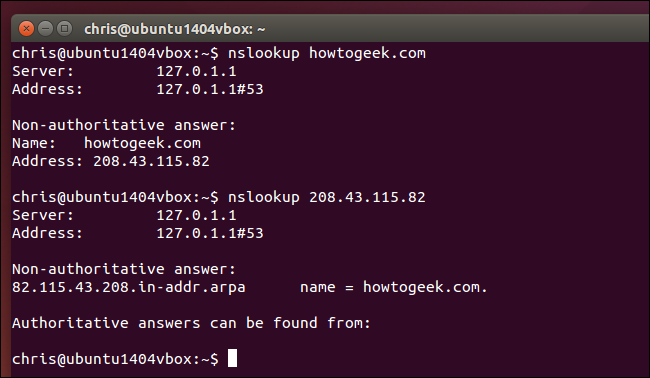 nslookup también le permite realizar una búsqueda inversa para encontrar el nombre de dominio asociado con una dirección IP. Por ejemplo nslookup 208.43.115.82 le mostrará que esta dirección IP está asociada con howtogeek.com.