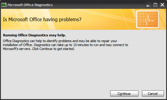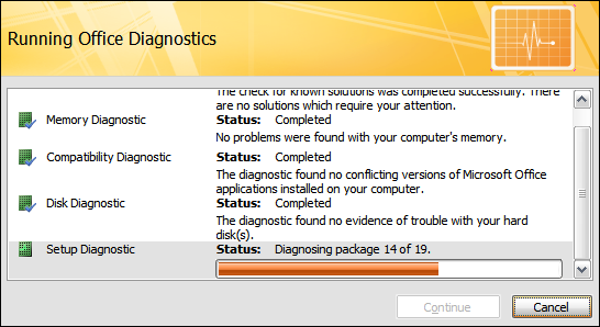 Se abrirá la pantalla de presentación de Diagnósticos de Microsoft Office.  Haga clic en Continuar.