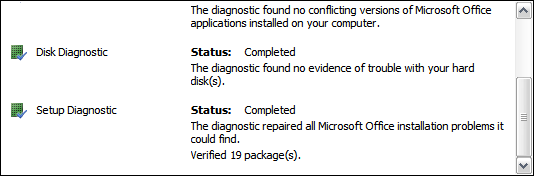 Desafortunadamente para un administrador o usuario avanzado, esta utilidad “tal cual” no muestra resultados específicos (debe investigar más).  Sin embargo, cuando tiene prisa y necesita que sus aplicaciones estén en funcionamiento para terminar su trabajo, Microsoft Office Diagnostics funciona muy bien.