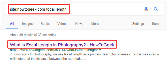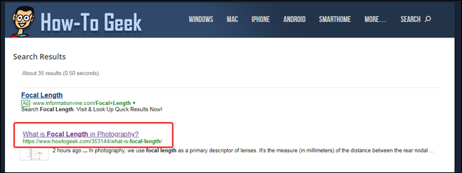 En la imagen de abajo, estamos usando Google y la frase de búsqueda “site:howtogeek.com distancia focal” para buscar solo las palabras clave del sitio howtogeek.com.